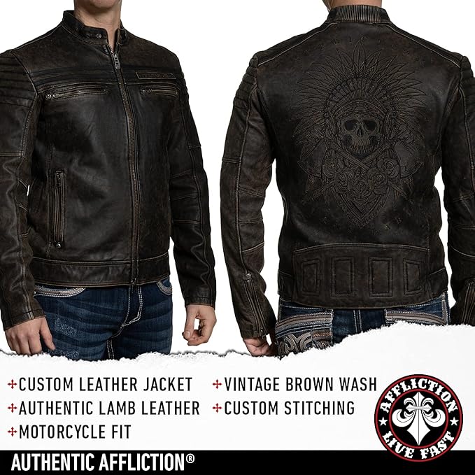 Shop from the world's largest selection and best deals for affliction black coats & jackets for men. Shop the affliction black premium gear up leather jacket for men at buckle.com. Limited edition 100%cow hide leather vintage wash custom leather patches padding with trapunto detail at shoulders and elbows american custom inspired artwork zip front jacket 6 zipper sleeve vents patch details. What started as a few friends creating some cool tees as a weekend project, has quickly turned into a ten year whirlwind journey with one goal: